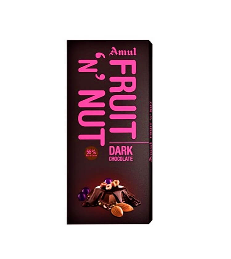 Amul Fruit N Nut Chocolate is enriched with crunchy almonds & raisins Which make it Crunchy, smooth texture, and delicious Chocolate. It is loaded with 55% Cocoa.
