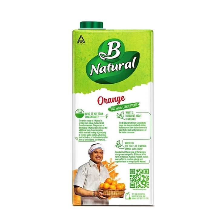 B Natural Orange Juice made with 100 % Indian authentic fresh Orange pulp and without any use of concentrate. In Process of B Natural fruit Juices, does not use the additional concentration with heating the pulp to remove water content.