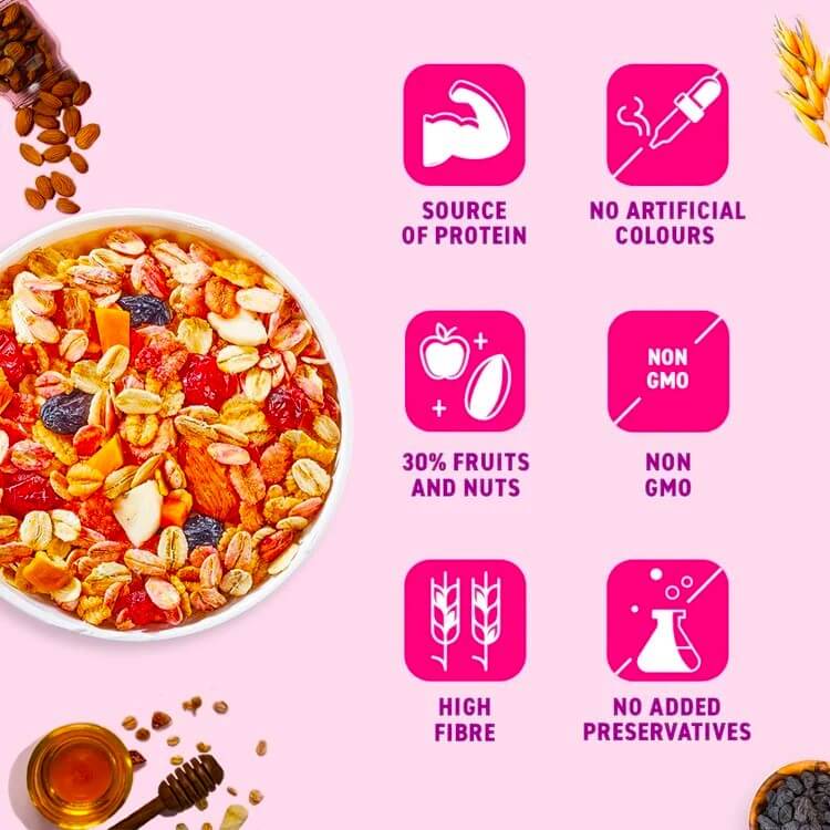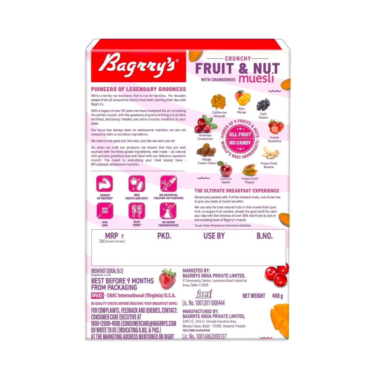 Bagrry's Muesli Fruit'n Nut with Cranberries Cereal is enriched with favorite fruits Mango, Papaya, Banana, Strawberry, and Cranberry that make it a healthy & exotic, and delicious cereal for you. This cereal has No artificial flavors, colours, or preservatives just the goodness of all-natural ingredients.