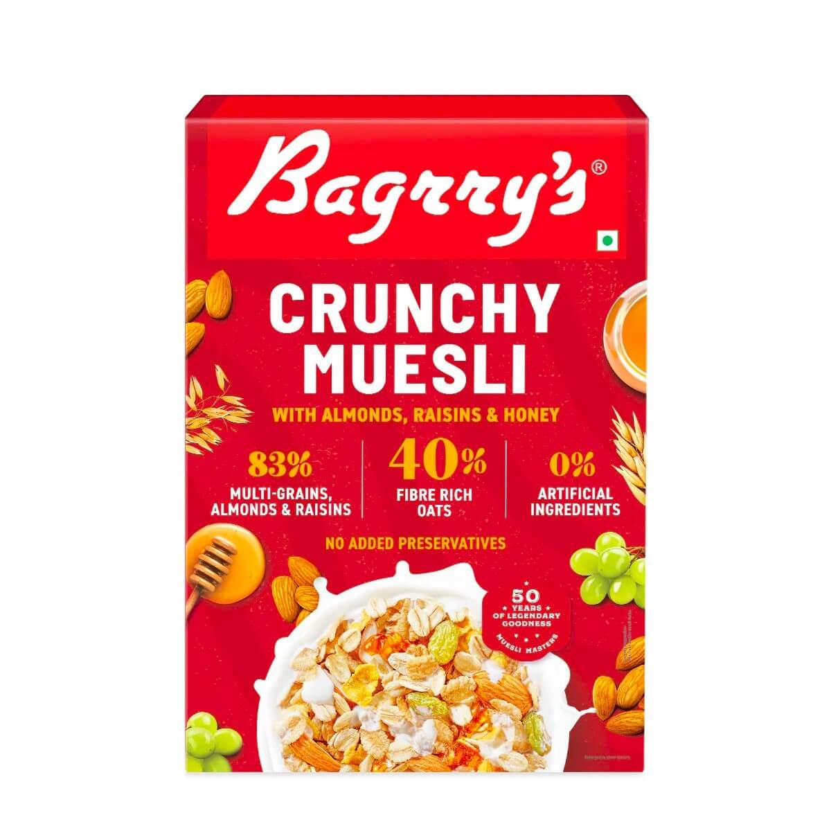 Bagrry's Muesli Healthy Crunchy Muesli Cereal is enriched with f goodness of British oats, golden wheat flakes, Californian almonds, delicious raisins and natural honey that make it a healthy & exotic, and delicious cereal for you. This cereal has No artificial flavors, colours, or preservatives just the goodness of all-natural ingredients.