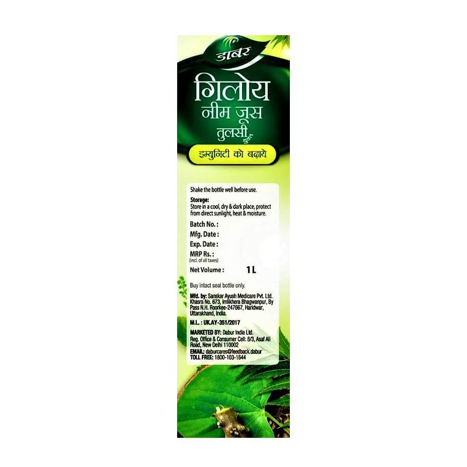 Dabur Giloy Neem Juice with Tulsi is 100 % Ayurvedic, Natural, Pure & Safe Juice with the strength of Giloy, Neem & Tulsi that provides more health benefits and boosts your immunity. It Improves your liver health & maintains your digestive system and also helps to reduce cholesterol.