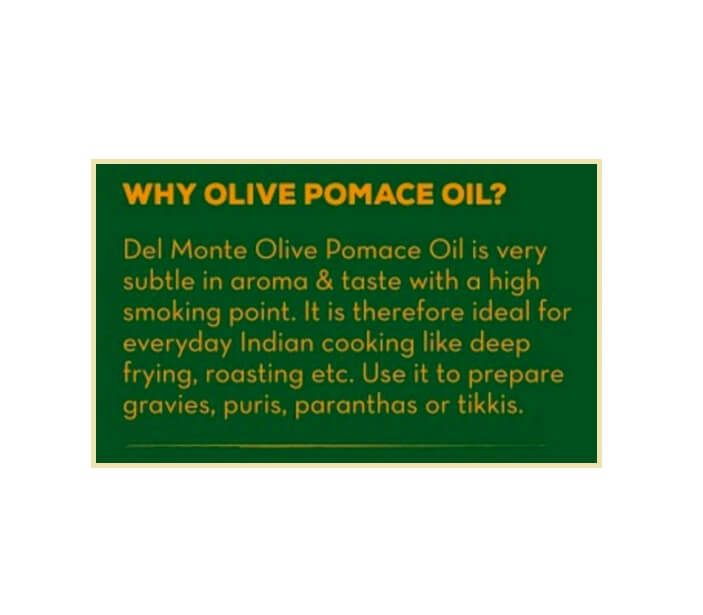 Del Monte Olive Pomace Oil is expertly crafted from carefully selected high-quality Olives, handpicked by farmers, using a meticulous pressing and blending method. Its rich and delightful flavour makes it ideal for everyday cooking and deep frying. This heart-healthy oil contains zero trans fats and zero cholesterol, promoting overall wellness and a cheerful heart.