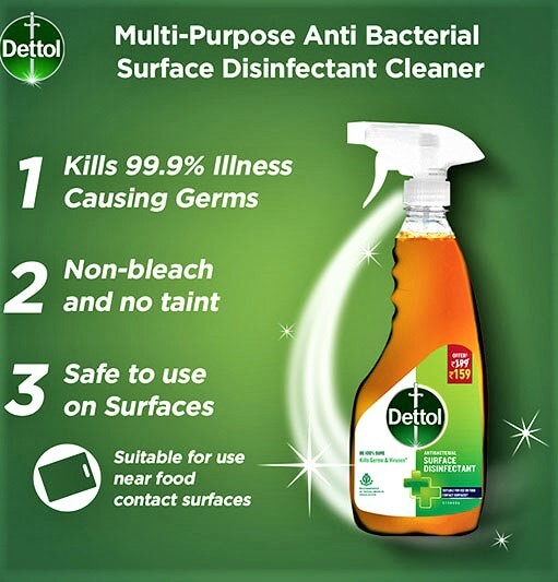 Dettol Antibacterial Disinfectant Spray uses to disinfectant the surface of floors, bathrooms, kitchens, table-sofa, which kill 99.9 % of Germs, Bacteria, & viruses from the surfaces and provides a safe environment around you.