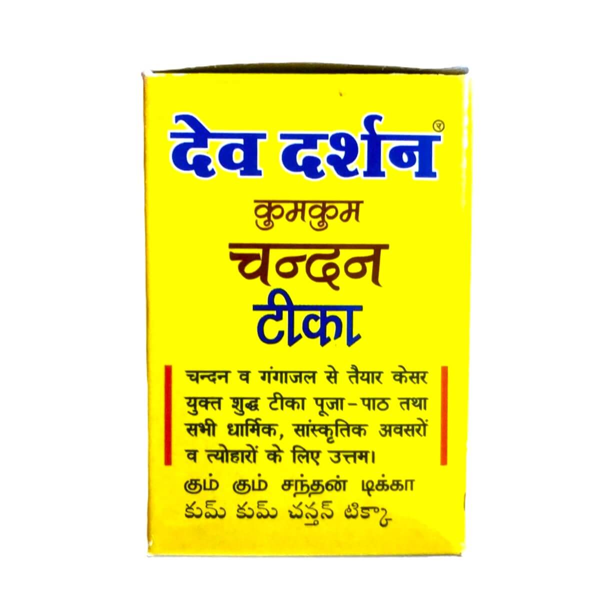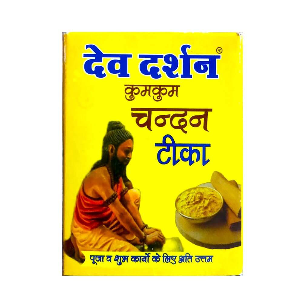 Devedarshan Kumkum Chandan Tika is a paste in wet form that is made from Gangajal, pure Chandan(sandalwood)powder, Kesar(saffron), and other natural herbs and it is applied as tika on the forehead in Indian festivals & worship Ceremonies.