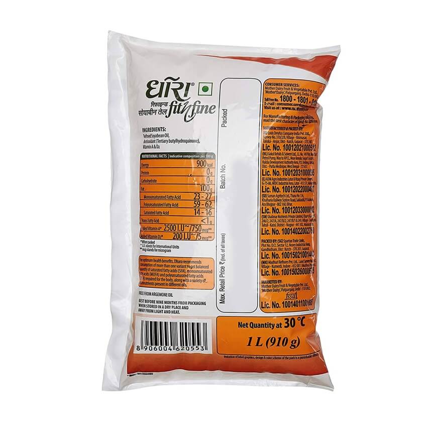 Dhara Fit & Fine Refined Soyabean Oil is Fortified with Vitamin-A & Vitamin-D2 and have content of Goodness of Natural Omega-3 & Omega-6.