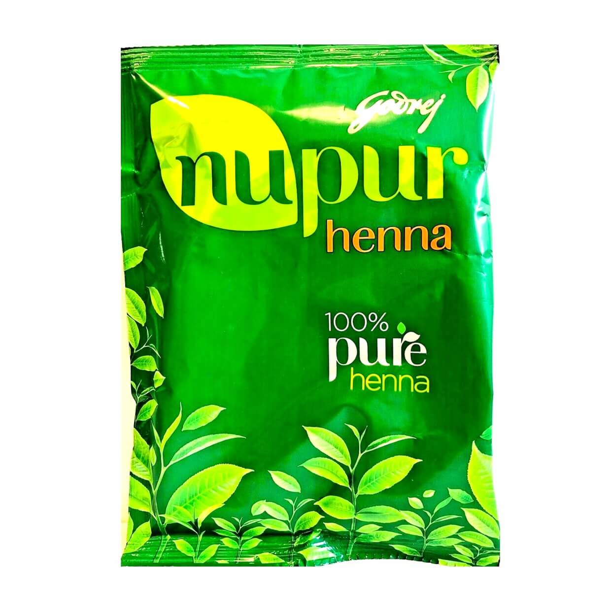 Godrej Nupur Henna is a 100 % Natural Henna that gives a natural deep color and beautiful look to the designs prepared on the hands and feet and is best for hair coloring and gives your hair a shiny look.