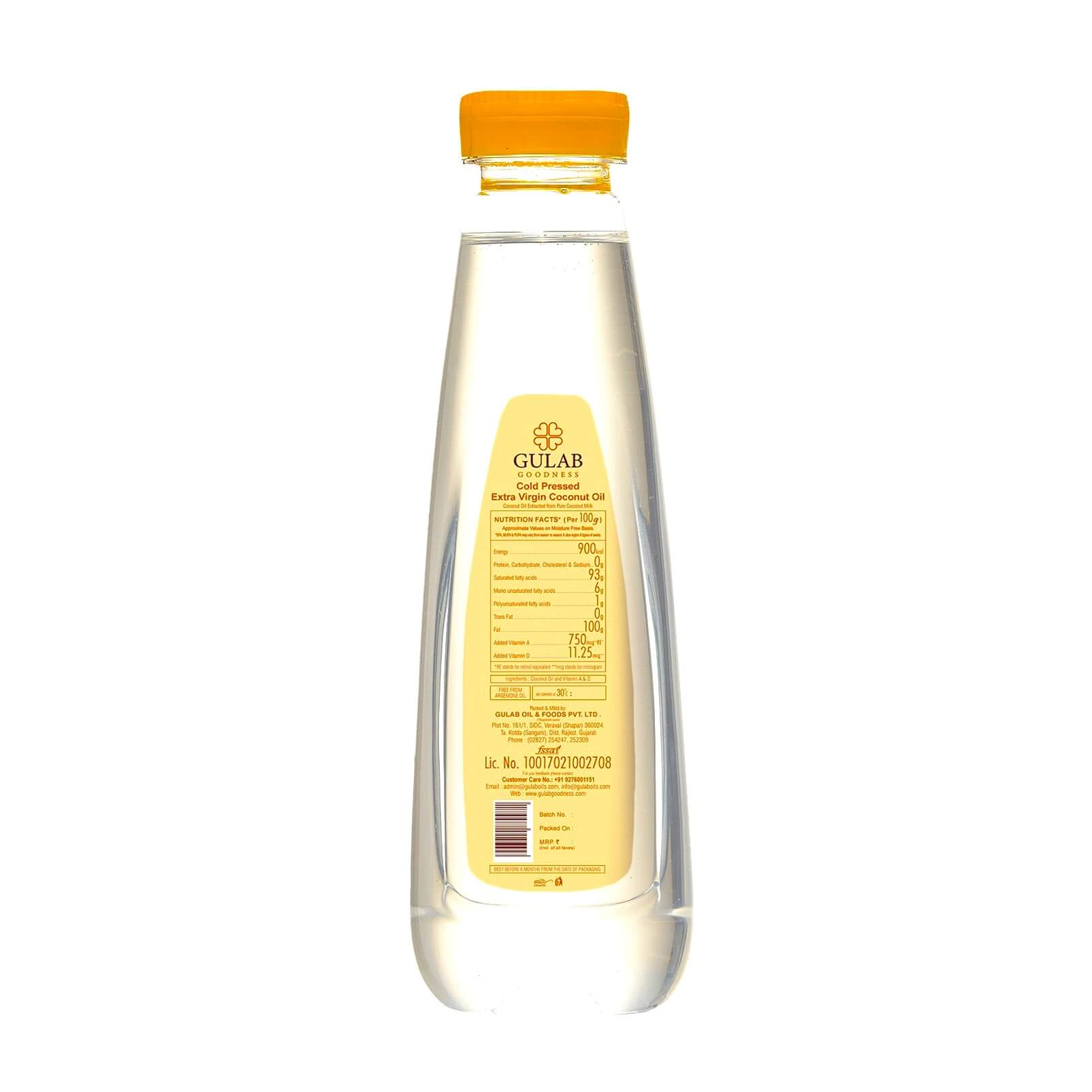 Gulab Goodness Cold Pressed Extra Virgin Coconut Oil is made from the best grade fresh coconut pulp & Milk in place of COPRA (Dry Coconut Gola) with an unrefined process and without the use of any chemical ingredients.