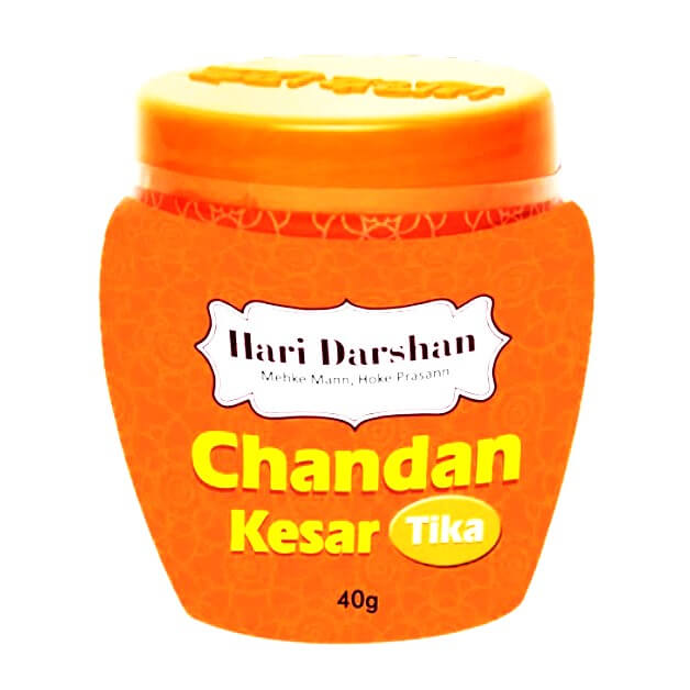 Hari Darshan Chandan(sandalwood) Kesar(Saffron) Tika is a paste that is made from pure Maysore chandan, saffron, and other natural herbs and used as tika on the forehead in Indian festivals. It is also used for writing Mantras and creating the symbol of Om or another traditional symbol during the worship of Lords.