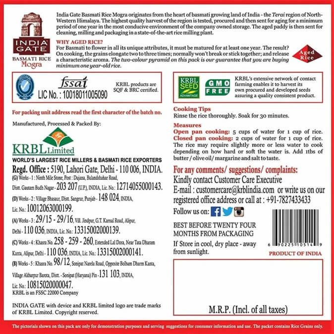 India Gate Basmati rice Mogra originates from the heart of the basmati growing land of India- The Terai region of North-Western Himalaya. The highest quality harvest of the region is tested, procured, and then sent for aging for a minimum period of one year in the most conducive environment of the company-owned storage. The aged paddy is then sent for cleaning, milling, and Packaging in state of an art rice milling plant.