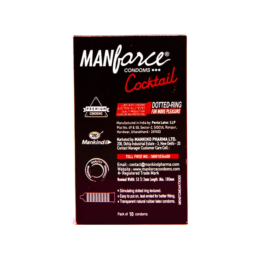 Manforce Cocktail Strawberry & Vanilla Flavoured Condoms has the design of Dotted Rings with Lubricated Latex & Flavor of Strawberry & Vanilla that also consist of Benzocaine Oil which gives a high level of pleasure to both partners.