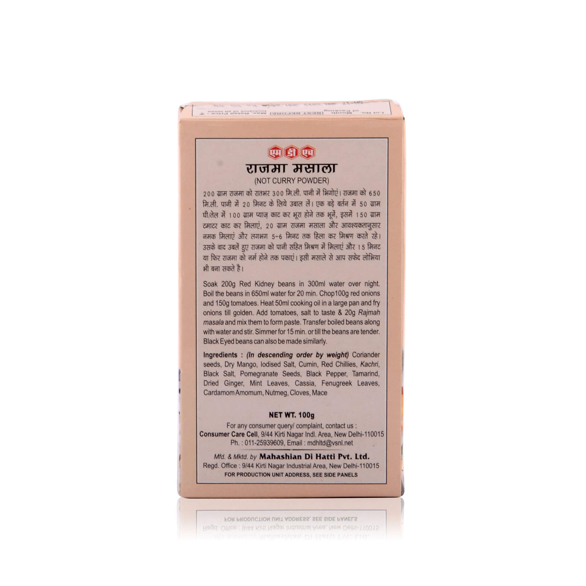 MDH Rajmah masala powder is a highly aromatic spice which is Mix of the following Ingredients: *Coriander seeds, *Cumin, *Black Pepper, *Cassia, *Dried Ginger, *Fenugreek Leaves, *Cardamom Amomum, *Yellow Chillies, *Cloves, Nutmeg, *Mace.