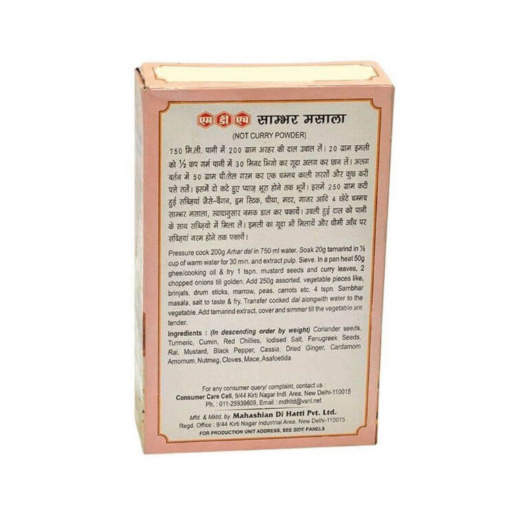 MDH Sambhar masala is a powdered blend of highly aromatic spices & Black Pepper which make it hot. Use of MDH Sambhar Masala make the south indian recipe - Sambhar Delicious.