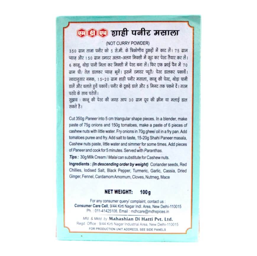 MDH Shahi Paneer masala is a powdered blend of highly aromatic spices & Black Pepper which make it hot. The use of MDH Shahi Paneer Masala makes your Shahi paneer Tasty.