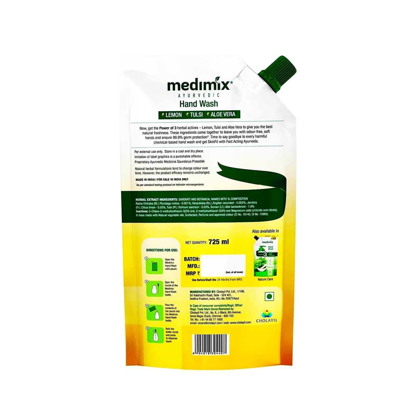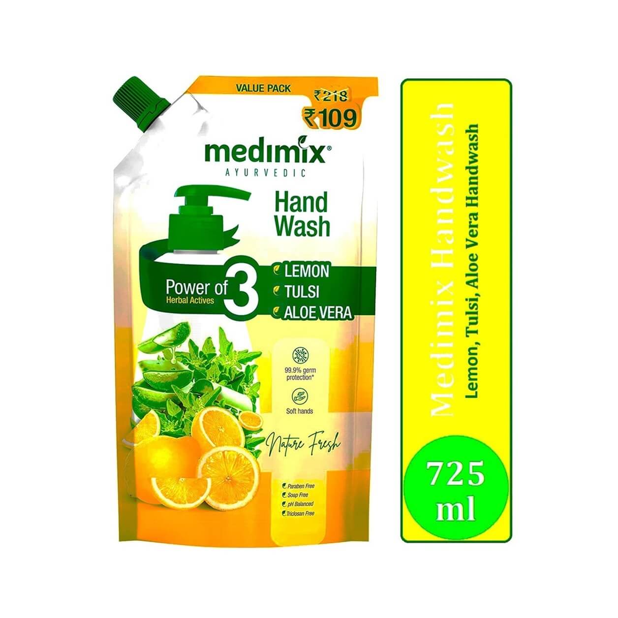 Medimix Ayurvedic Lemon, Tulsi & Aloe Vera Handwash is made with the natural 03 herbs of Neem, Tulsi & Aloe Vera that provide 99.9 % germ protection and gives you naturally clear & protected skin.