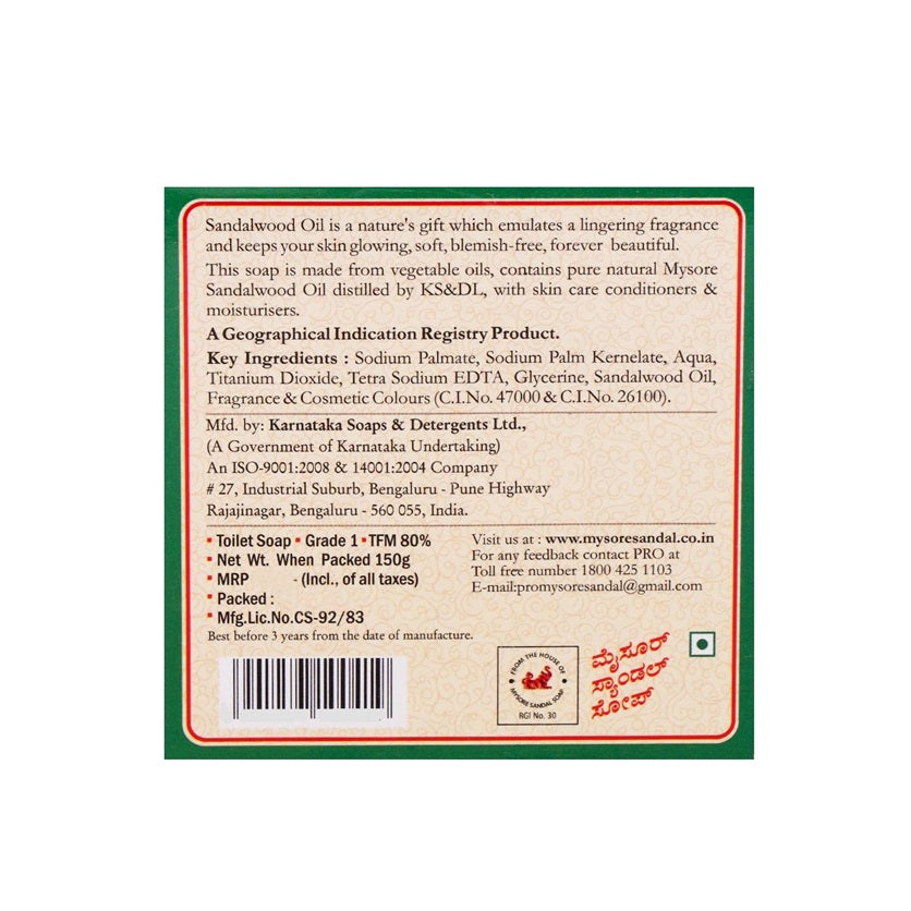 Mysore Sandal Soap is enriched with vegetable oils & original Mysore Sandalwood oil that provide proper skincare with exotic fragrance. It is also enriched with moisturizers & conditioners which nourish your skin and give wrinkle & blemish-free skin with a splendid glow.