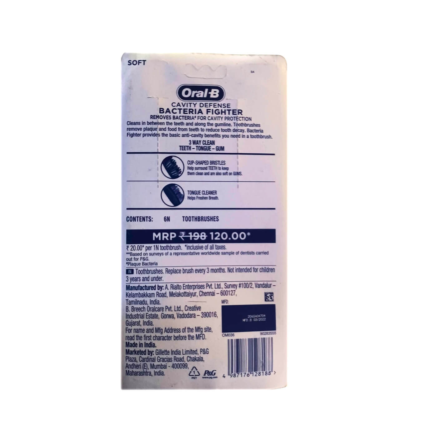 Oral B Bacteria Fighter Toothbrush removes bacteria and provides cavity protection to your teeth. It Cleans between the teeth and along the gumline. It removes plaque and food from the tooth to reduce tooth decay.