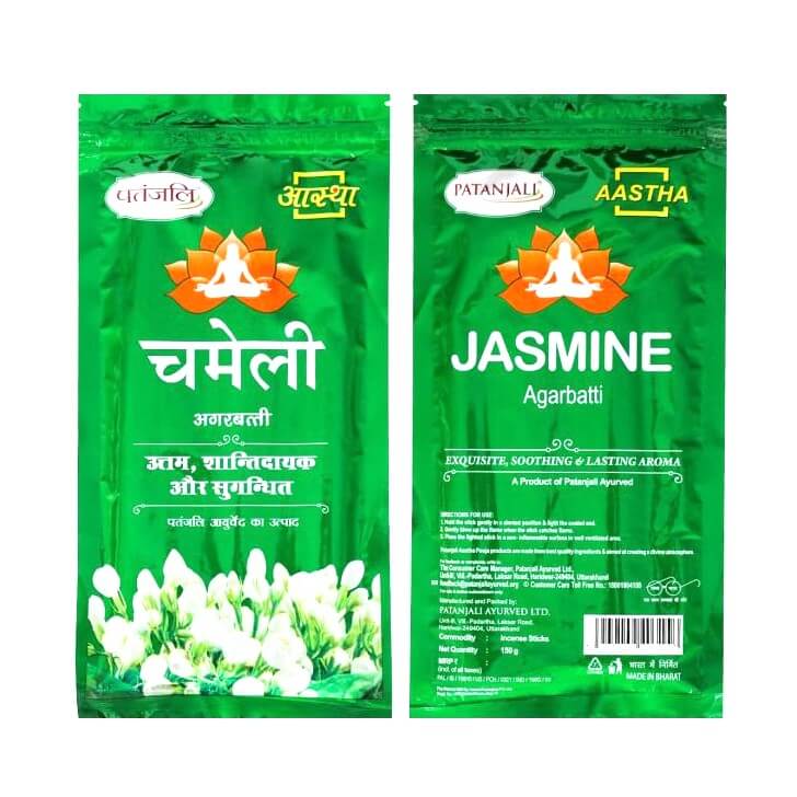 Patanjali Aastha Jasmine/chameli Agarbatti is made from the Jasmine flower & leaves and other natural & ayurvedic herbs that emit the rich fragrance of jasmine flowers that make your environment religious and help the devotee to connect with God.
