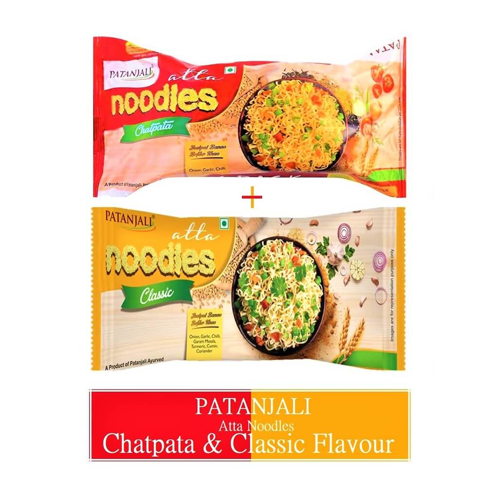 Patanjali Atta Noodles are made with 100 % vegetarian ingredients of whole wheat and rice bran oil with spicy taste and packed with delicious Chatpata & Classic Masala pack which is a mix of the goodness of turmeric powder, cumin seeds, onion, ginger, and garlic.