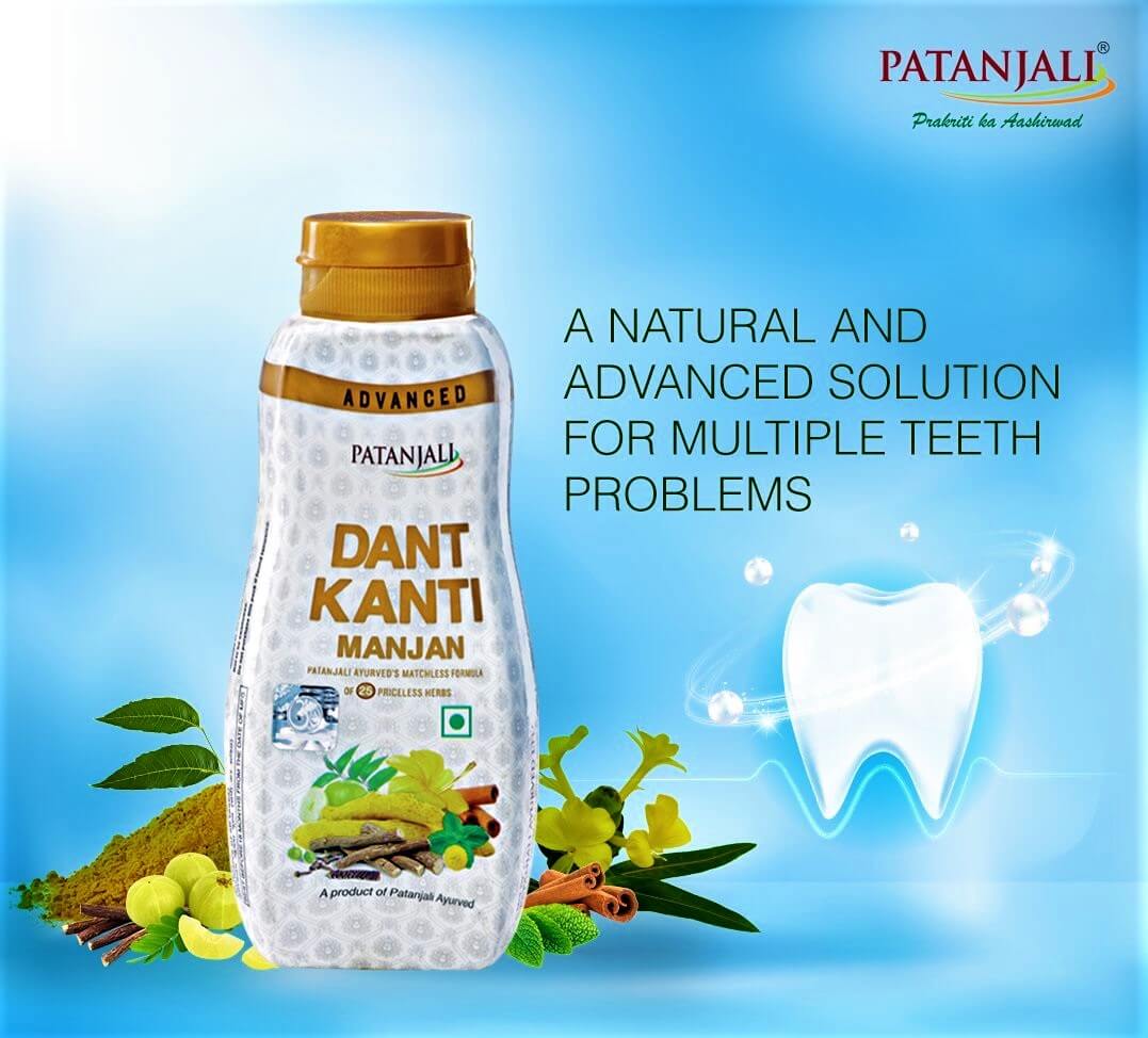 Patanjali Dant Kanti Manjan is ready with ayurvedic ingredients like Babul, Akarkara, Pudhina, Pipli, Neem, Timbaru, Turmeric, Cloves, Maju-Phal, and Peelu that prevent all types of Dental Problems such as Pyria, Gingivitis, Gum-Pain, Bad breath, etc.