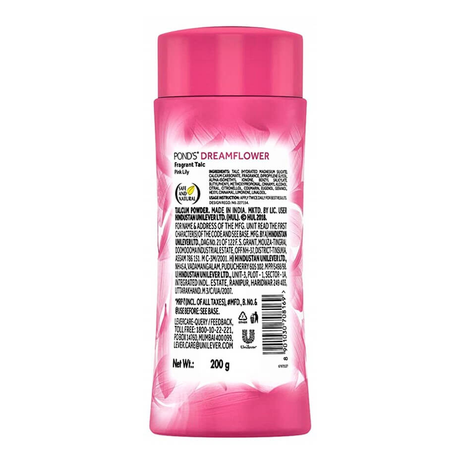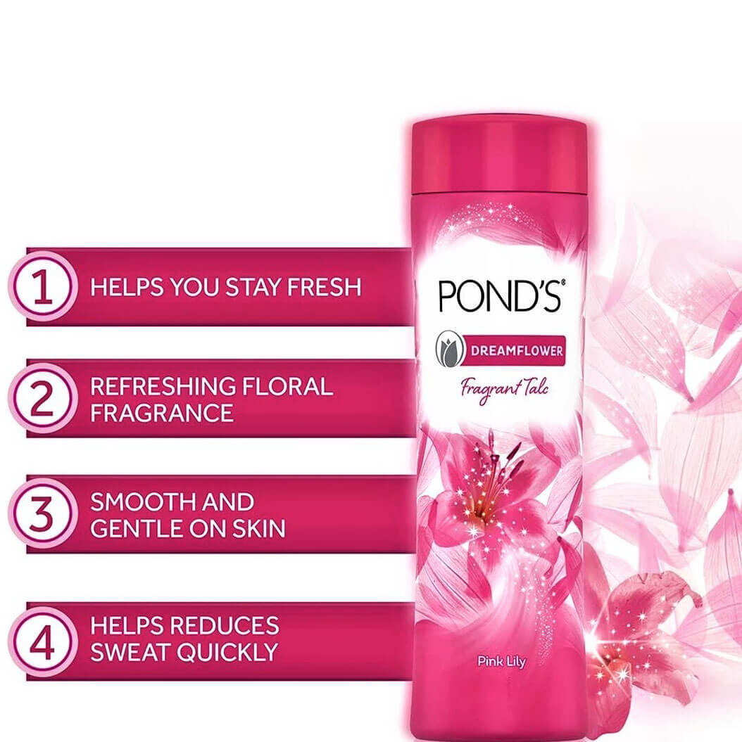 Ponds "Dreamflower Pink Lily Fragrant" Talcum Powder absorbs and reduces your body Sweat and makes your Body refresh with smooth skin.