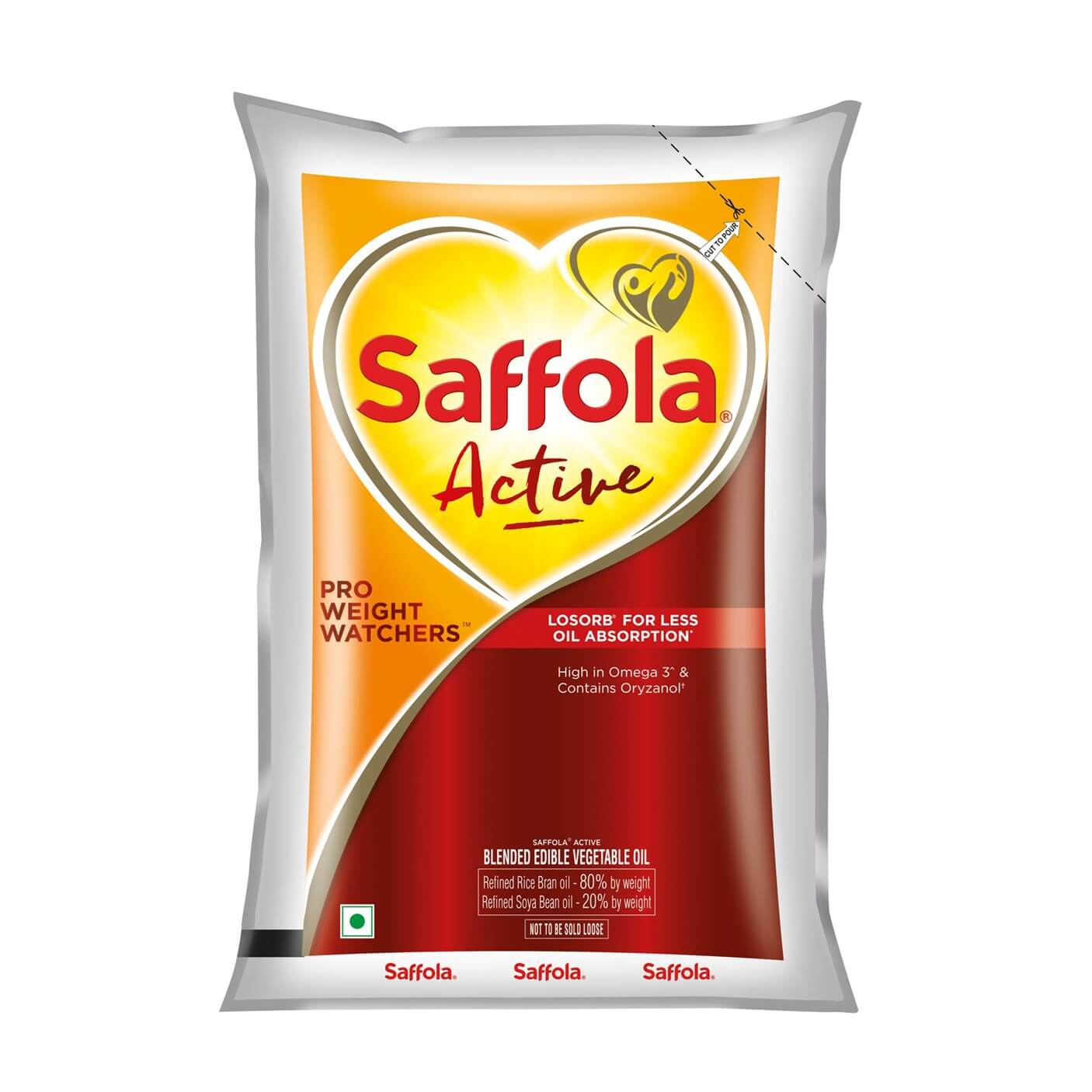 Saffola Active Blended Edible Vegetable Oil is the perfect choice for those who are conscious about their fitness. With Losorb Technology, it helps your food absorb up to 27% less oil, while its Dual seed technology balances healthy fatty acids. Its Omega-3 promotes a healthy blood cholesterol level, and the added vitamins A and D aid in maintaining good eyesight and strong bones.