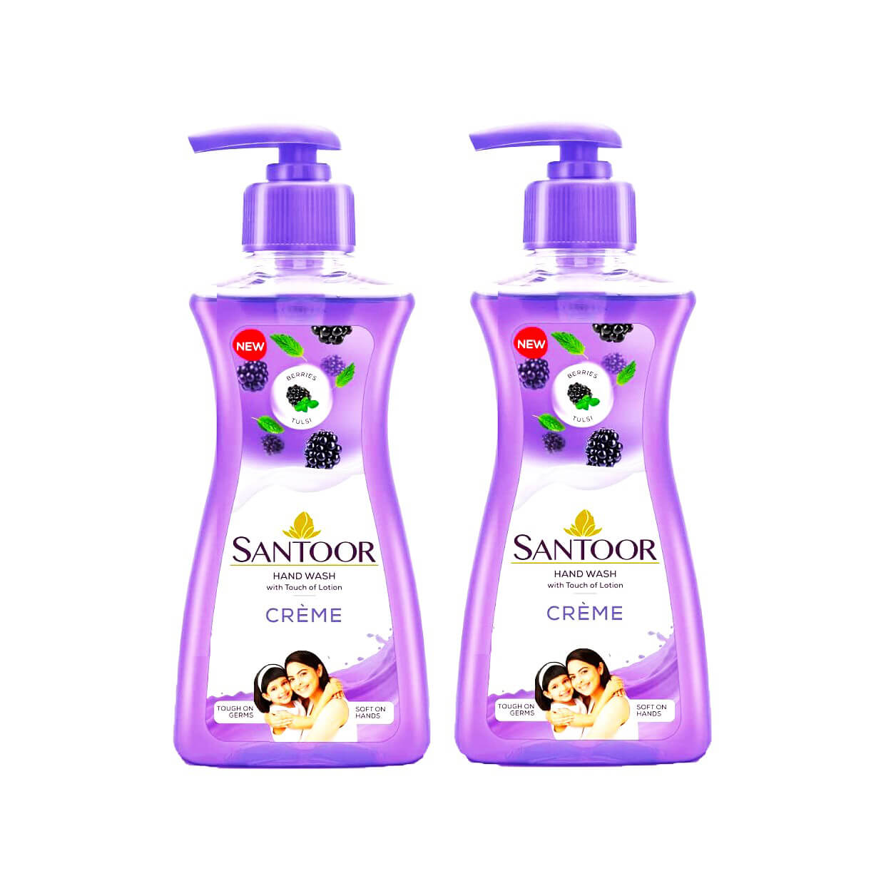 Santoor Gentle Handwash Creme has the goodness of Berries & Tulsi that Care for your hand skin and help to keep your skin clear, and soft, and provide tough protection from Germs & Viruses.