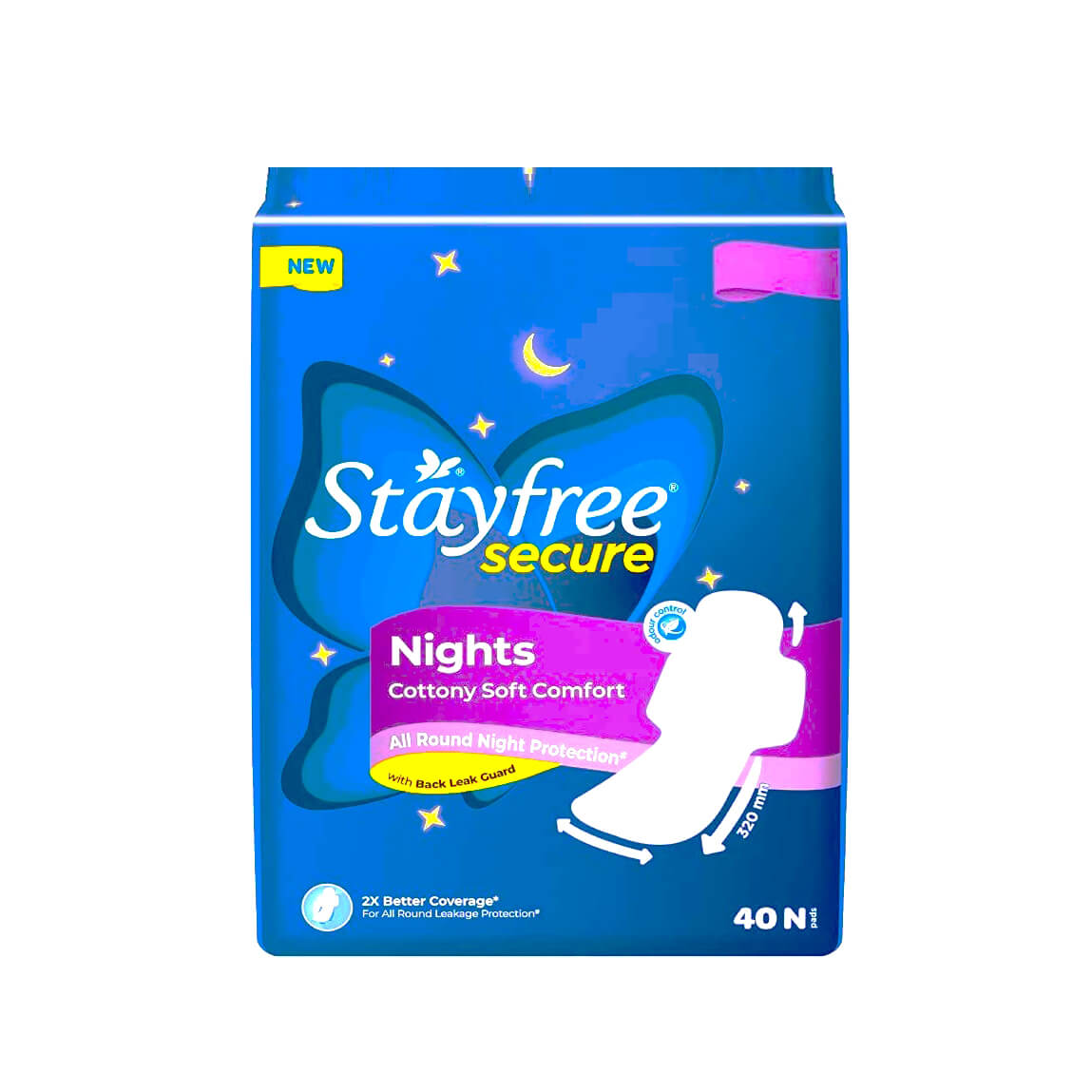 Stayfree Secure Night Cottony Soft Comfort Sanitary Pads is specially designed with a wing That prevents it from Shifting protects you from any leakages. Its Cottony soft Pad is Made with soft and gentle material which gives protection from dryness and rashes and is worry-free from periods.