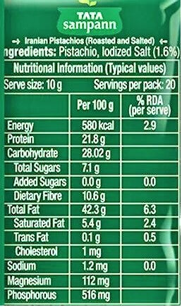 Tata Sampann Iranian Pistachios Roasted and salted are already iodized and enriched with protein, Magnesium & Phosphorous that help to strengthen your Bones. It is also rich in dietary Fibre that helps to balance your diet and keep your body healthy gives you taste delicious with salt.