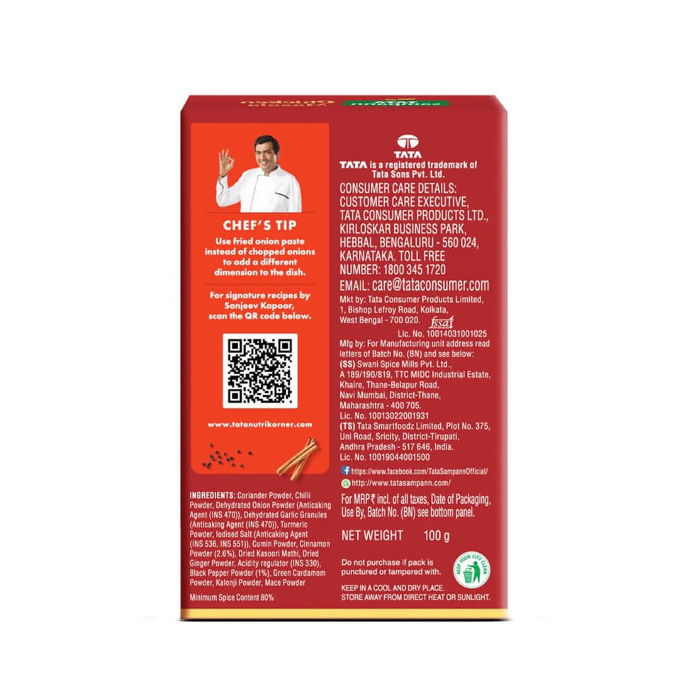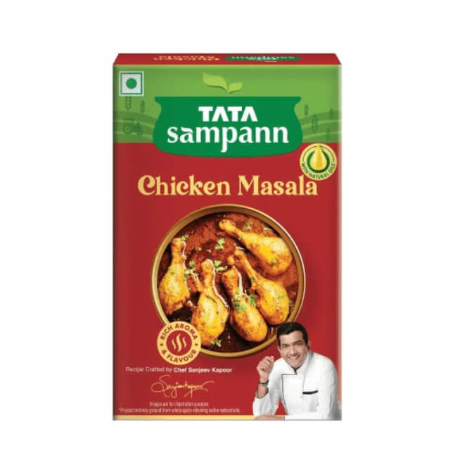 Tata Sampann Chicken Masala is a blend of premium spices like Coriander, dried bay leaf, cumin seeds, black pepper, dried ginger, cassia, and other potent ingredients, making it a top choice for preparing various Indian dishes, especially those with vegetables as the main ingredient.