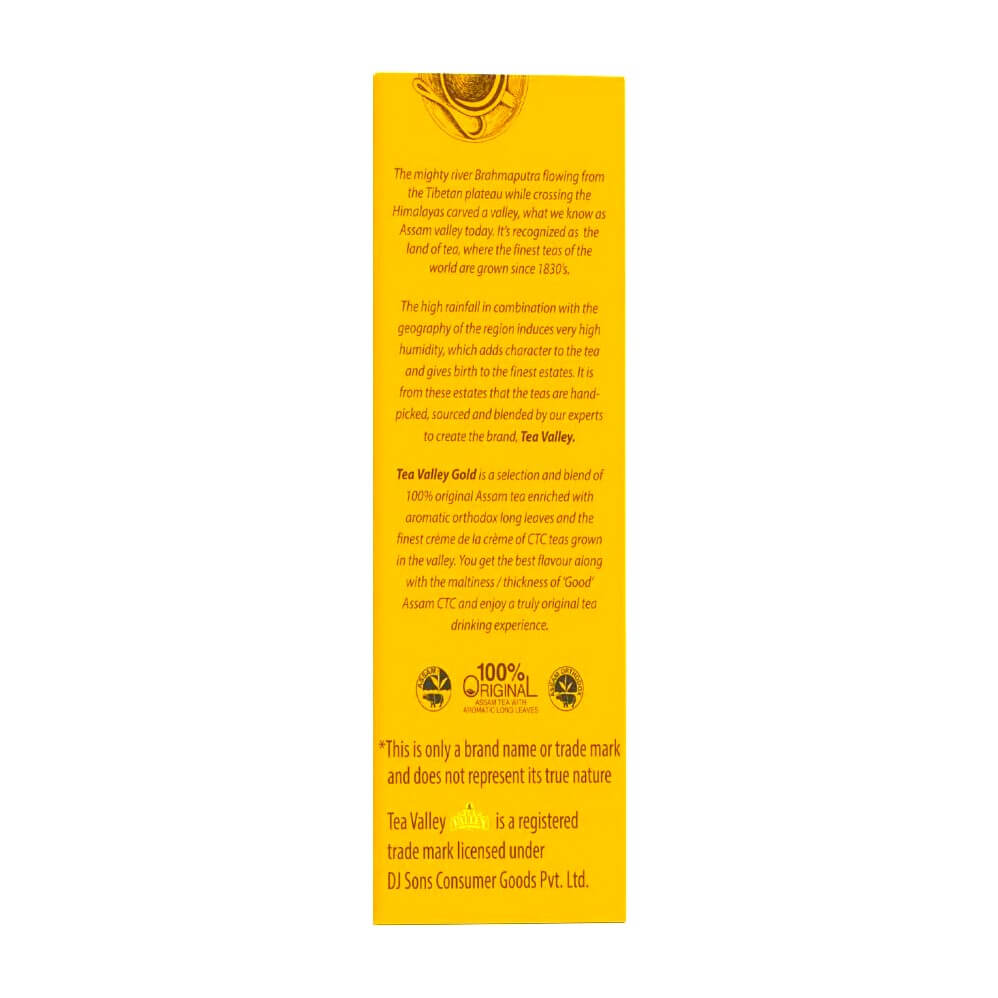 Tea Valley Gold Tea is a 100 % original premium malty thickness Assam Tea that has 85% CTC Tea & 15 % Aromatic Long Tea Leaves and gives a new awesome experience of having tea and gives you a special start to your daily.