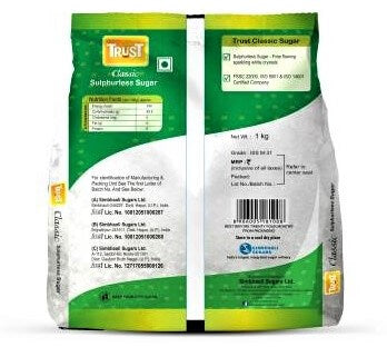 Experience the pureness of Trust Classic Sulphurless Sugar with these top-quality features: no harmful chemicals, UV irradiation for bacteria-free grains, free-flowing white crystals, and compliance with European standards (less than 50 I.U). Plus, our product is certified by ISO 9001:2008, ISO 14001:2004, and FSMS 22000:2004, ensuring the highest quality for our 100% vegetarian customers.