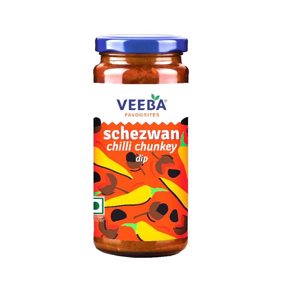 Veeba Shezwan Chilli Chunkey Dip Chutney is made from dried red chillis, shezwan pepper, and garlic flavored which makes it perfect with Noodles, Fried Rice, and snacks.